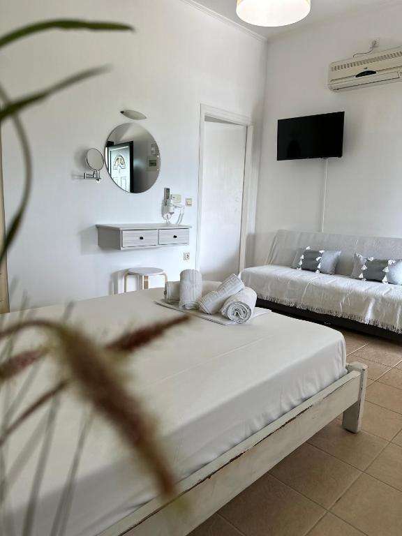 Διαθέτει διπλό κρεβάτι και πτυσσόμενο καναπέ που μετατρέπεται σε κρεβάτι, καλύπτοντας με ευελιξία τις ανάγκες κάθε επισκέπτη. Για οικογένειες με μικρά παιδιά, μπορεί να προστεθεί παρκοκρέβατο, κατόπιν συνεννόησης.